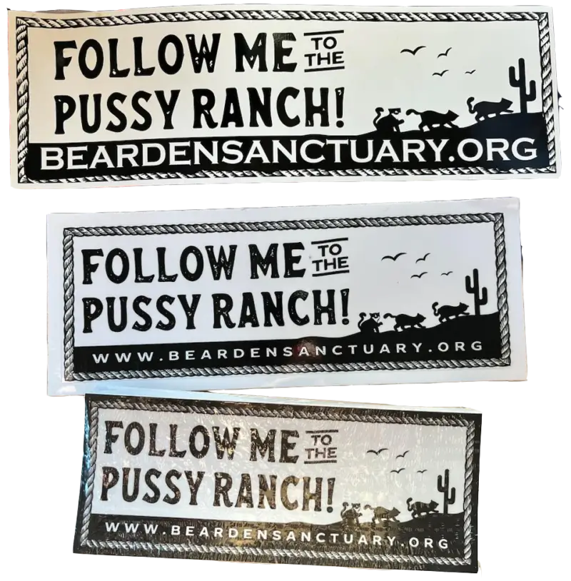 These "Follow Me To The Pussy Ranch" stickers are 3 x 7.5 inches and are perfect for the back of your car or other products. Our eye-catching bumper sticker features the catchy phrase "Follow Me to the Pussy Ranch" in bold letters, sure to turn heads and spark conversations. And the best part? Every penny from your purchase goes directly to a cat sanctuary that rescues, shelters, and cares for cats in need.